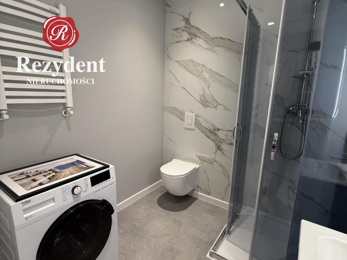 Łazienka (4m2) z kabiną prysznicową, toaletą, umywalką oraz pralko-suszarką.
